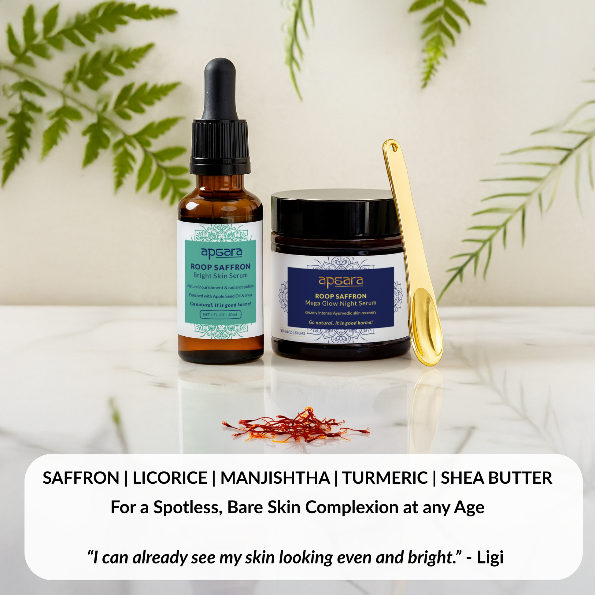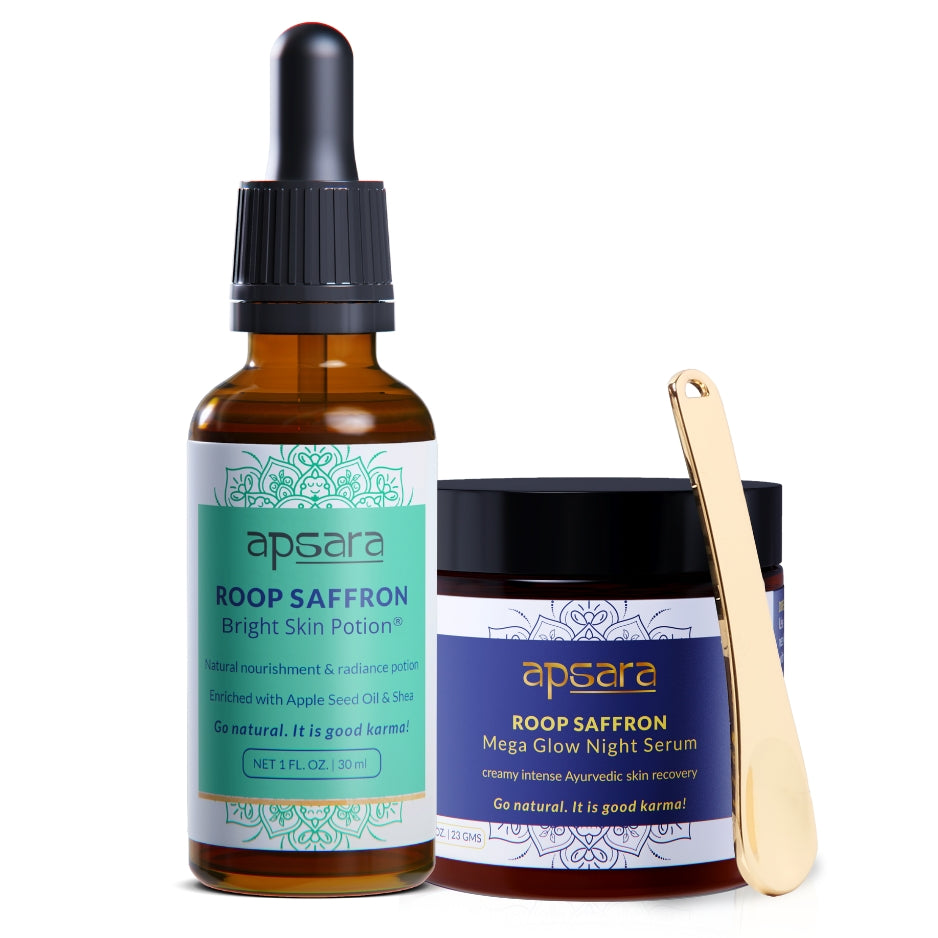 Apply 2-3 drops of ROOP Saffron Bright Skin Potion to lightly cover your skin. Add more if needed. Massage with firm, circular strokes until it is absorbed by the skin. Use after your Apsara cleanser & toner meant for your skin type. Use a pea-sized amount of ROOP Night Mega Glow Serum on your face & neck at night before bed. Massage with upward circular strokes for 2-3 minutes. Wipe off any excess with a tissue or a soft cloth. Use after your Apsara cleanser & toner meant for your skin type.
